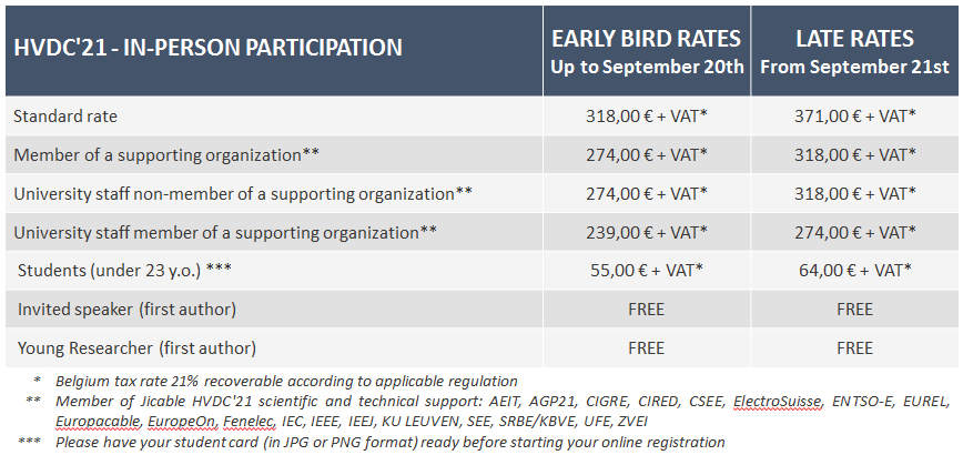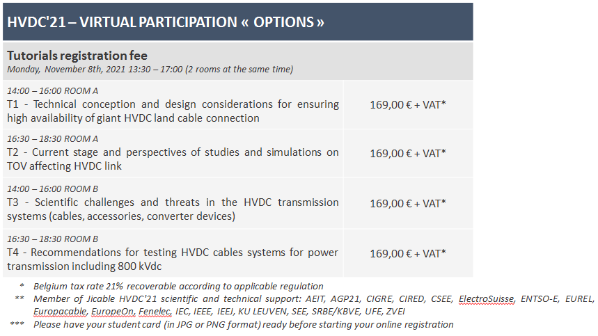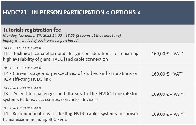 - Gala dinner option: participation to Jicable HVDC’21 gala dinner (multiple registration possible for an accompanying person)